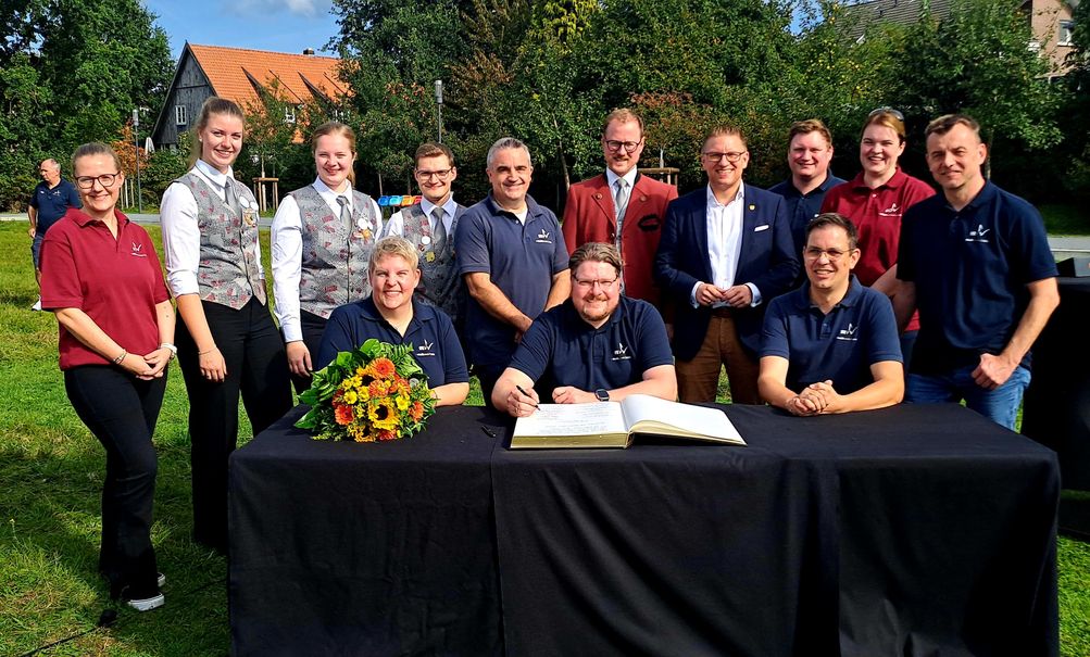 Im Frühjahr nahm das Jugendorchester mit „gutem Erfolg“ beim Deutschen Musikfest in Ulm und Neu-Ulm teil, die älteren Instrumentalisten aus dem Musikverein heimsten sogar die Höchstnote „hervorragend“ ein. Dies war für Robin Rieksneuwöhner Grund genug, dass sich alle Aktiven in das Goldene Buch der Stadt Verl eintragen durften. „Der gesamte Musikverein setzt Maßstäbe, hier spielen viele Talent auf Spitzenniveau.“ Der Verein sei ein Aushängeschild der Stadt. Rieksneuwöhner: „Den Eintrag in das Goldene Buch sehen wir als Anerkennung“. Insbesondere lobte er die ehrenamtlichen Tätigkeiten im Musikverein Verl. „Und auch den Familien der Musikerinnen und Musiker gebührt großer Dank für die Rückendeckung.“