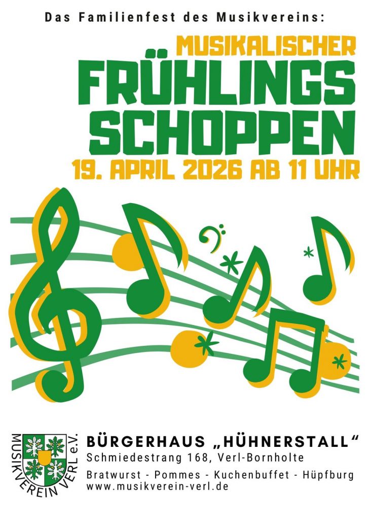 Der Musikverein Verl lädt herzlich zum traditionellen musikalischen Frühlingsschoppen ein. Dieser findet am Sonntag, 19. April 2026, ab 11 Uhr im und rund um das Bürgerhaus „Hühnerstall“ (Schmiedestrang 168, Verl-Bornholte) statt.